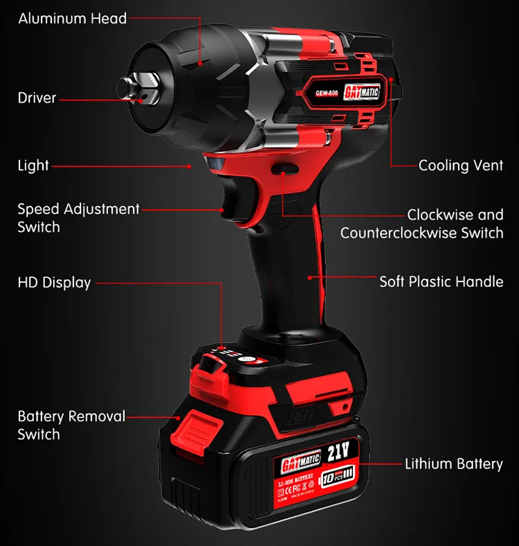 Equipped with a next-generation 21V lithium-ion battery, the GEW-800 ensures electric impact wrench extended runtime and consistent power delivery. Its large capacity supports prolonged use, reducing downtime and enhancing productivity on demanding tasks.