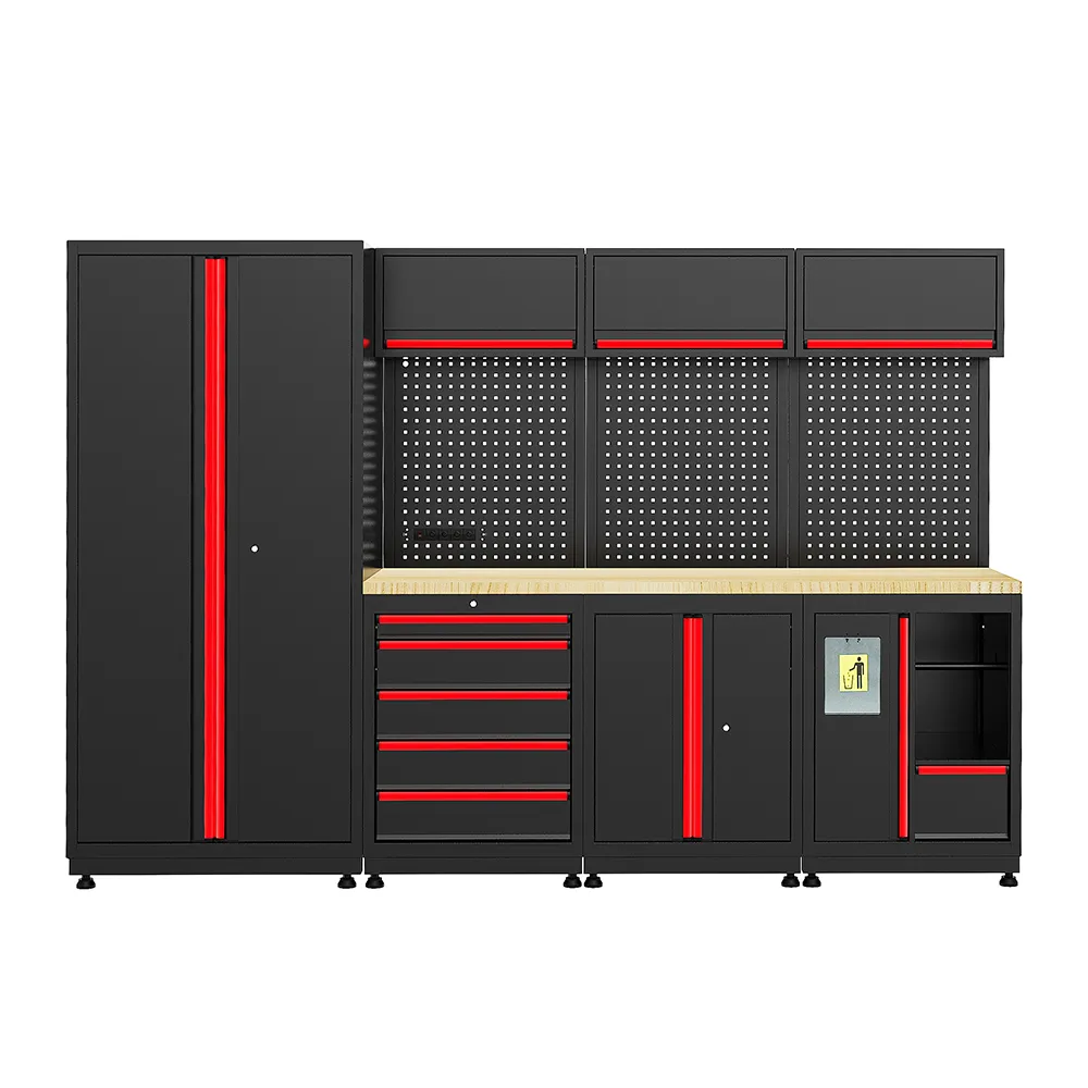 This garage cabinet storage system features three large-capacity storage compartments on the top, each equipped with an air pressure lock for safety. Integrated LED lighting improves visibility, supporting accurate repairs and workshop efficiency in low-light conditions.
