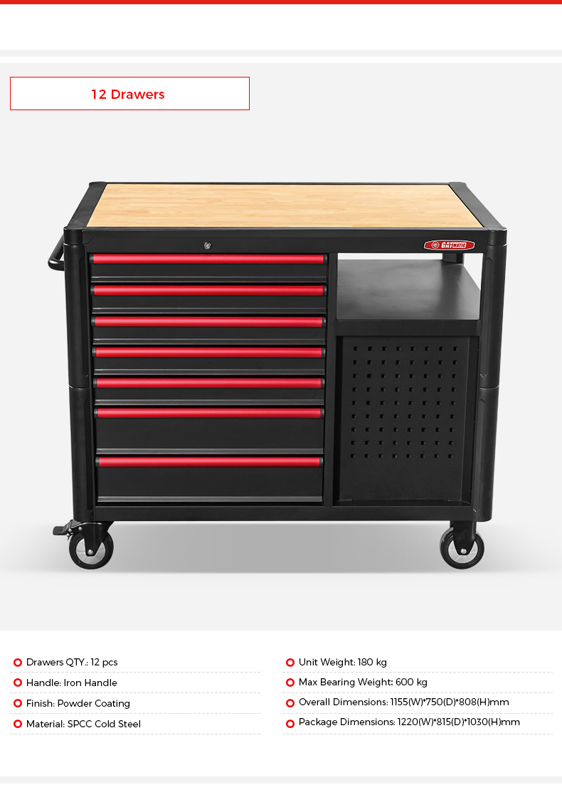 Crafted from robust stainless steel, the tool cart boasts durability and corrosion resistance. The worktop is thoughtfully designed to accommodate a variety of tasks, making it an ideal companion for a multitude of applications. Its mobility is enhanced by swivel casters, allowing for easy movement within the workspace, while locking mechanisms ensure stability during operation. With multiple drawers, shelves, and compartments, the tool cart provides organized storage for tools of different sizes, facilitating quick and efficient access.