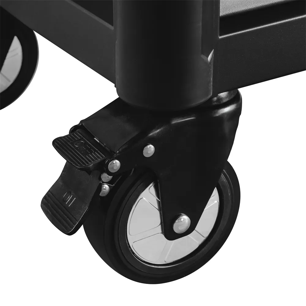 4 casters with toe brakes let you maneuver the wood worktop tool cabinet right where you need it and then lock the wheels to keep the chest from moving while you work. The swivel casters make the tool cart easily push and can bear 600kg.